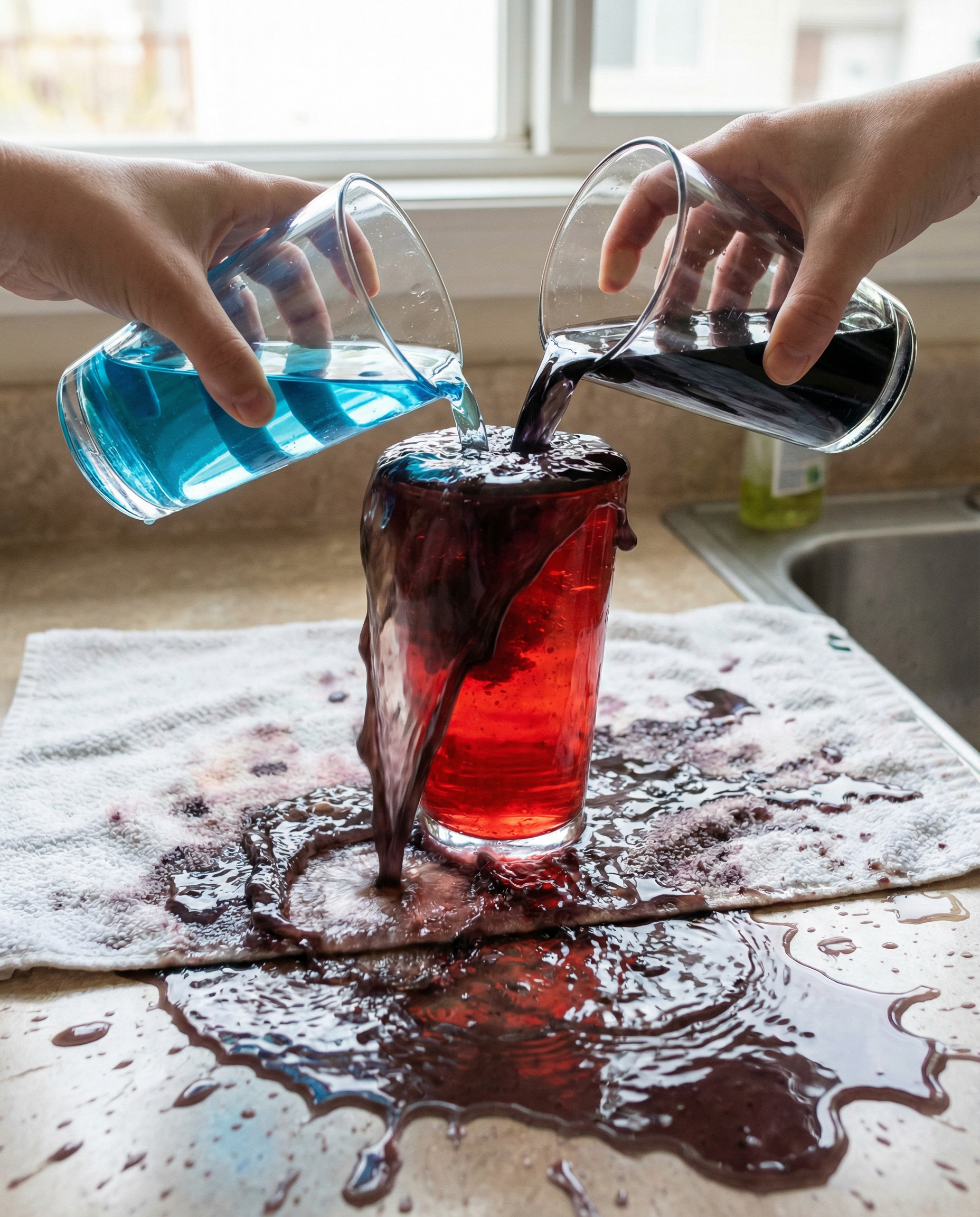 I have a glass full of water with red color in one glass and blue colour in another glass, and black colour in another glass; what happens when I pour blue and black water into the red glass? Remember, all 3 glasses are full; show me what happens with an image.