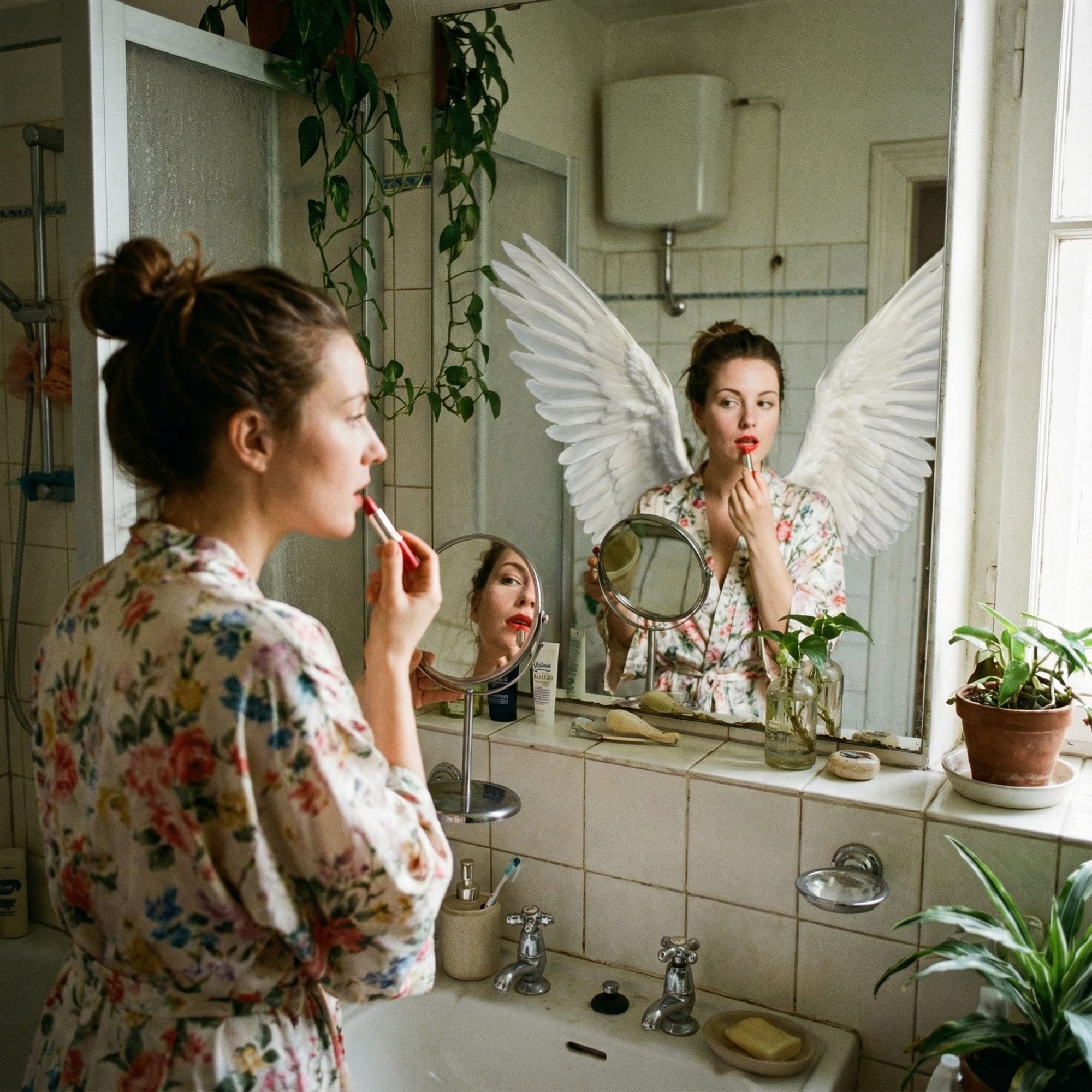 A woman is applying lipstick in a small round vanity mirror in her bathroom. The reflection in the mirror is completely accurate, except she has elegant white angel wings that do not exist in the real room behind her.