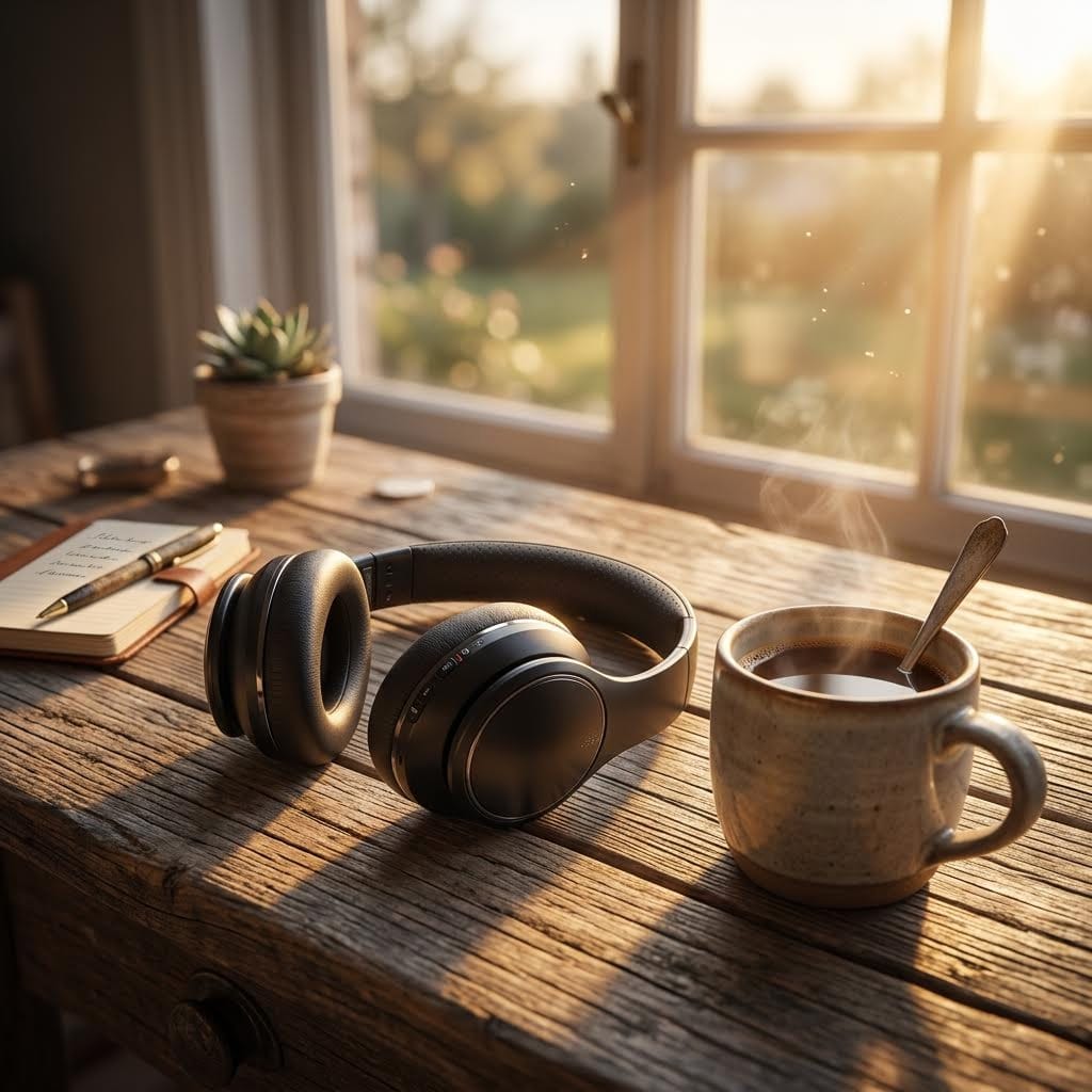 Product staging via i2i lets brands photograph products once in a studio, then generate multiple lifestyle contexts without location shoots. The test: take a studio headphone shot on a neutral background and place it in a warm morning desk setting.