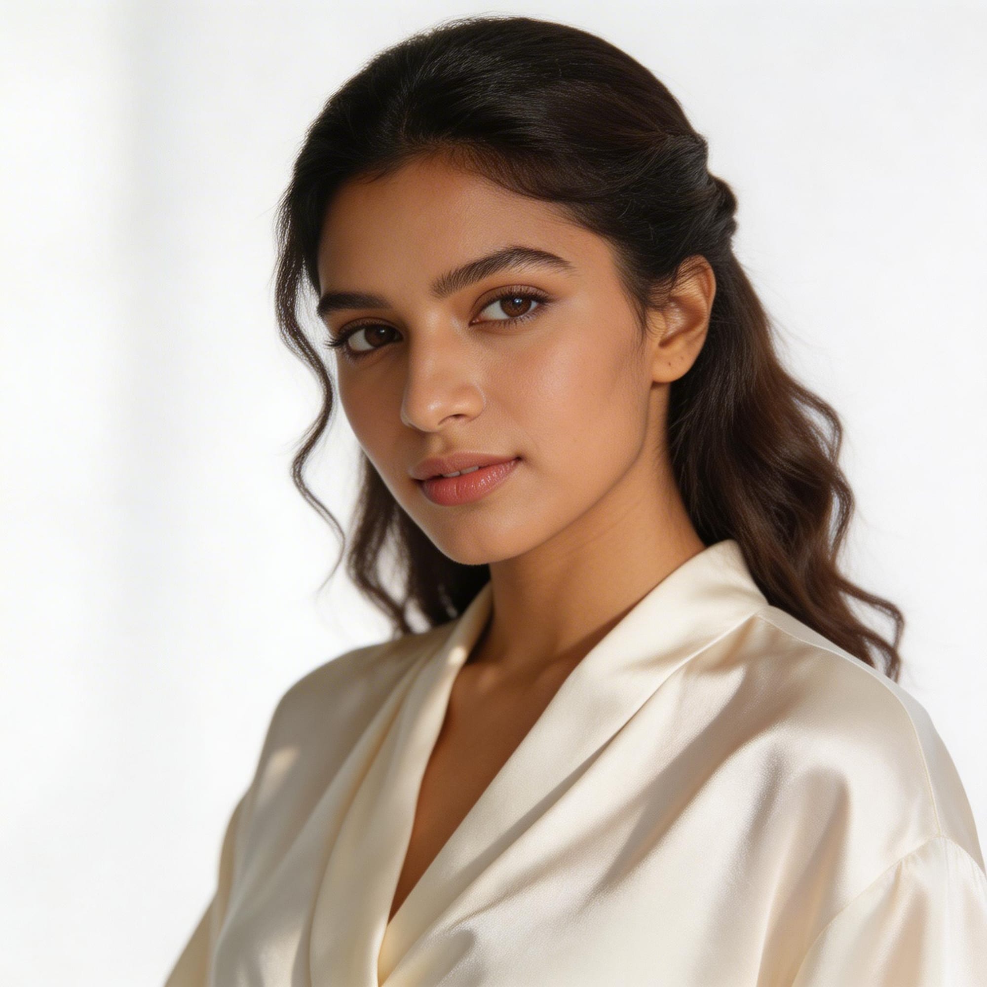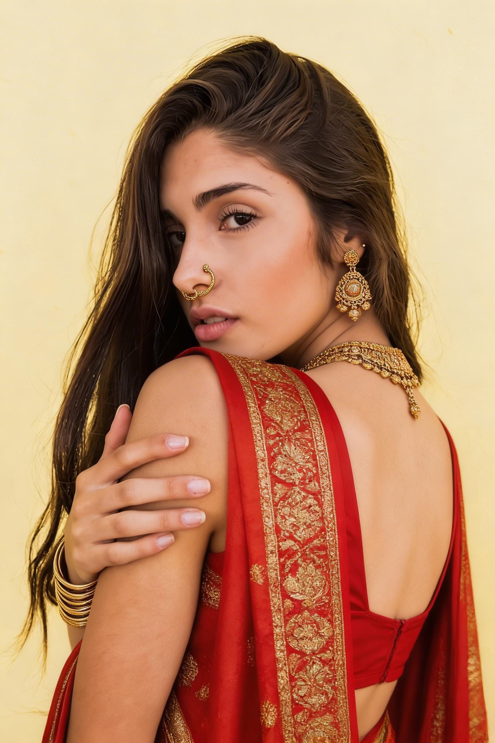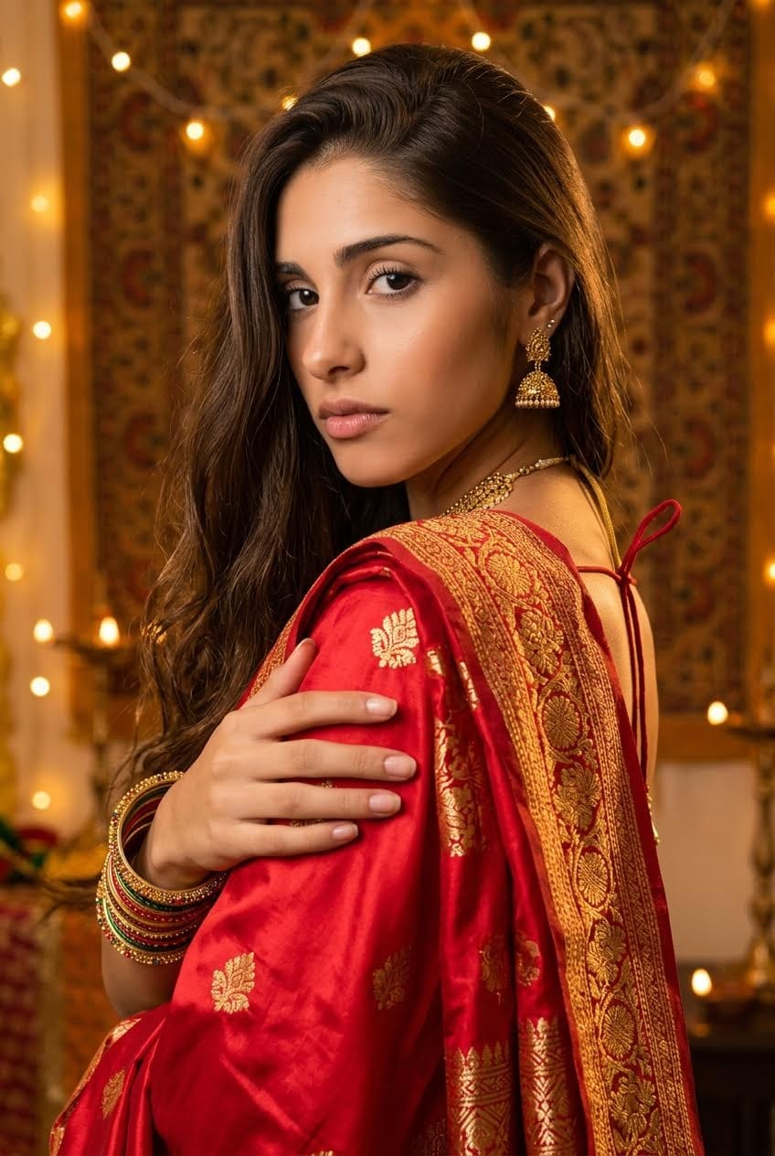 Fashion try-on is one of the highest-value commercial applications for image-to-image generation. Brands want to show a garment on a model without a reshooting for every SKU. The test: take a clean editorial portrait and swap the outfit to a traditional Indian saree.