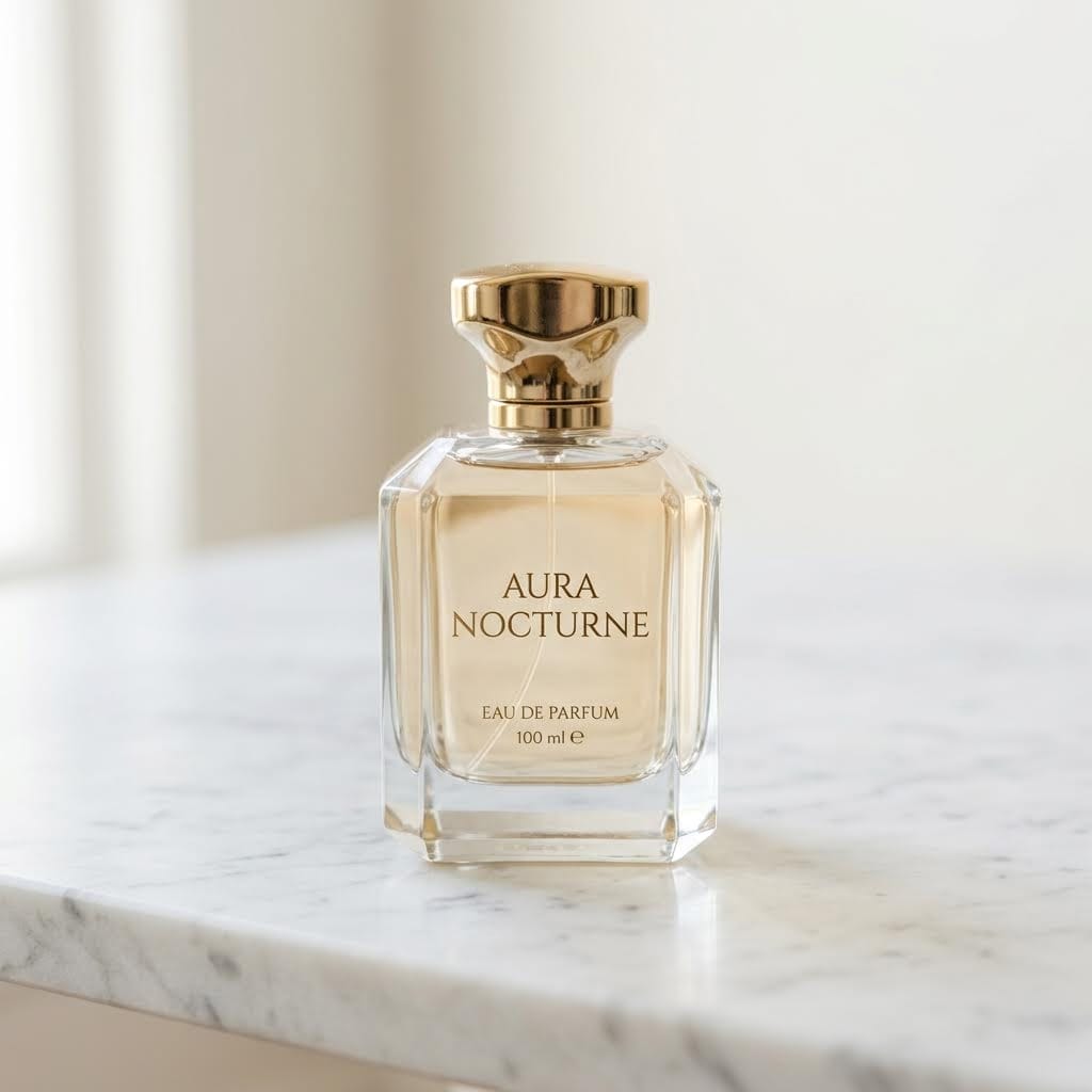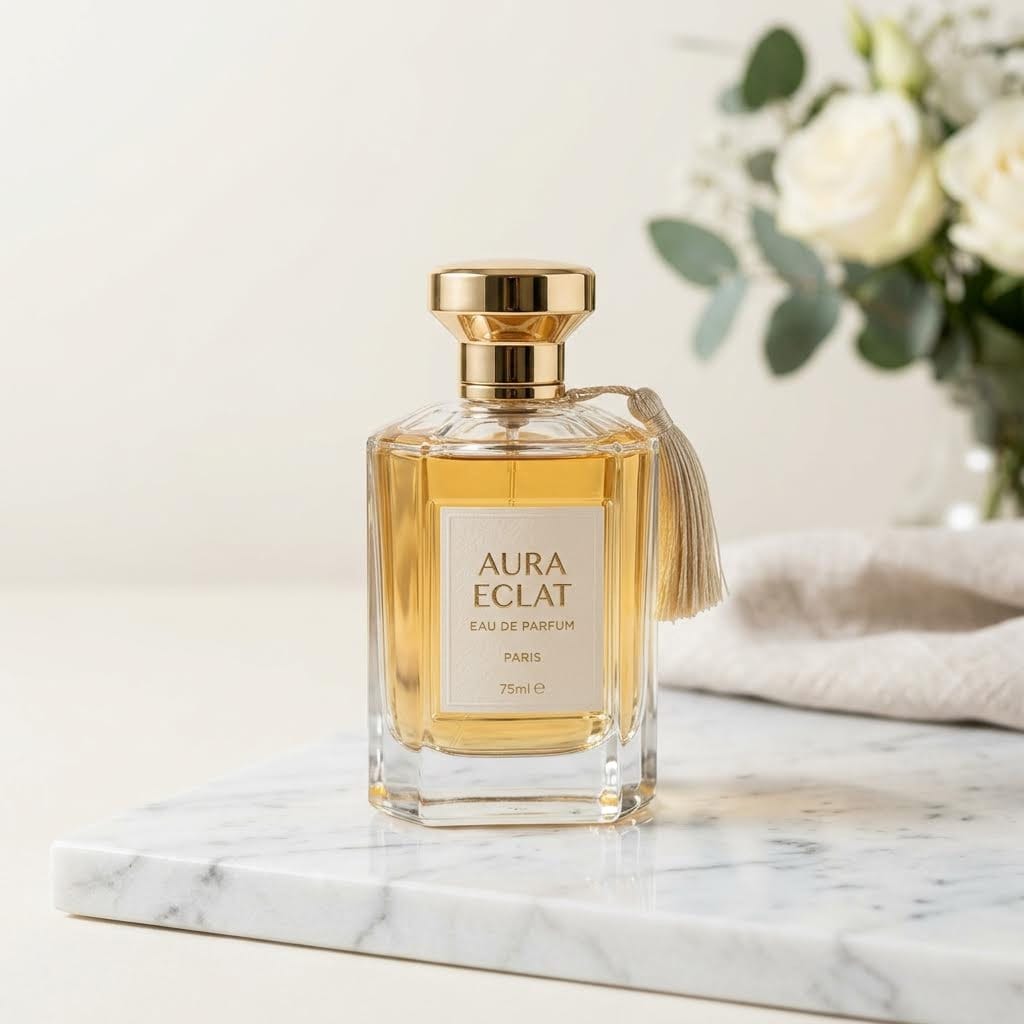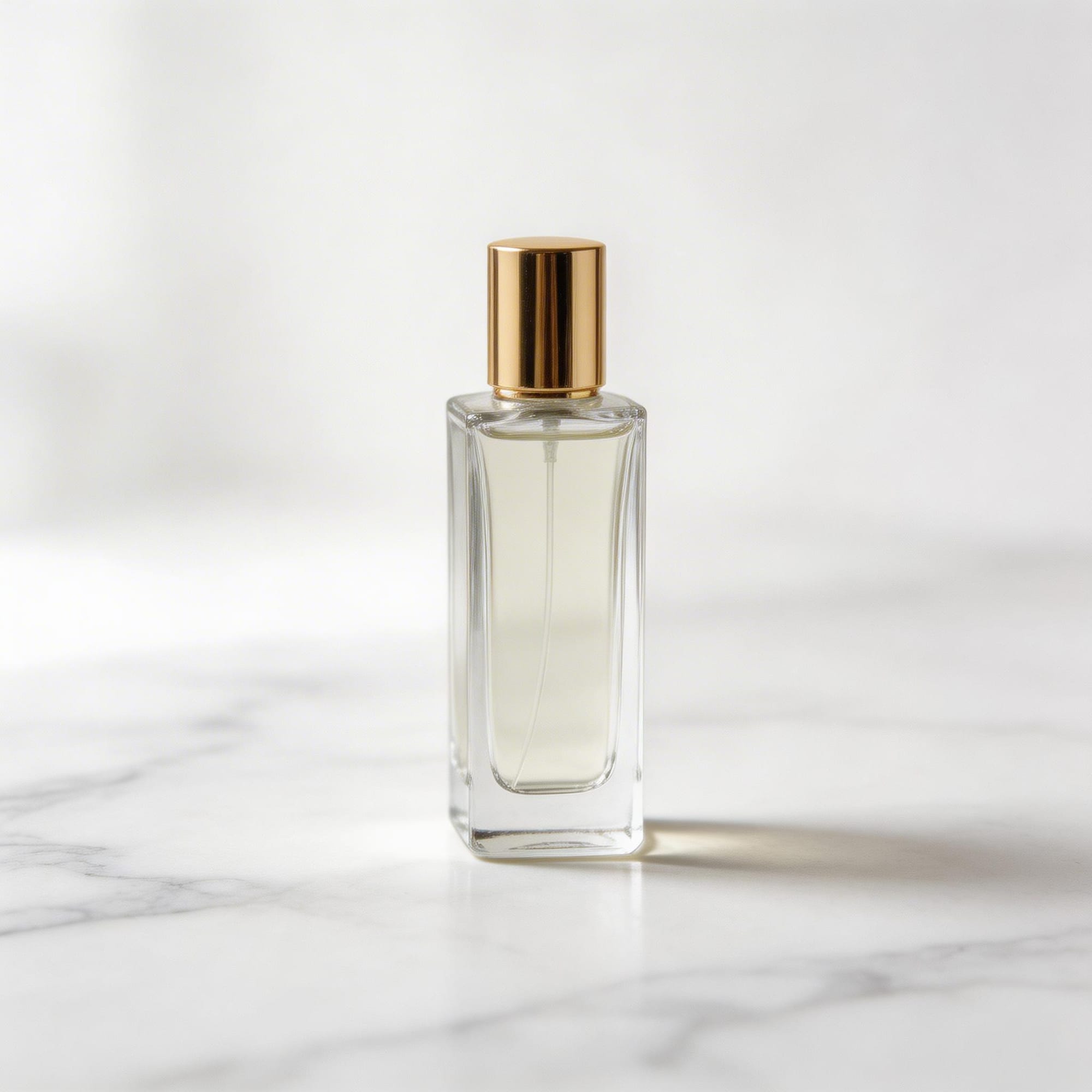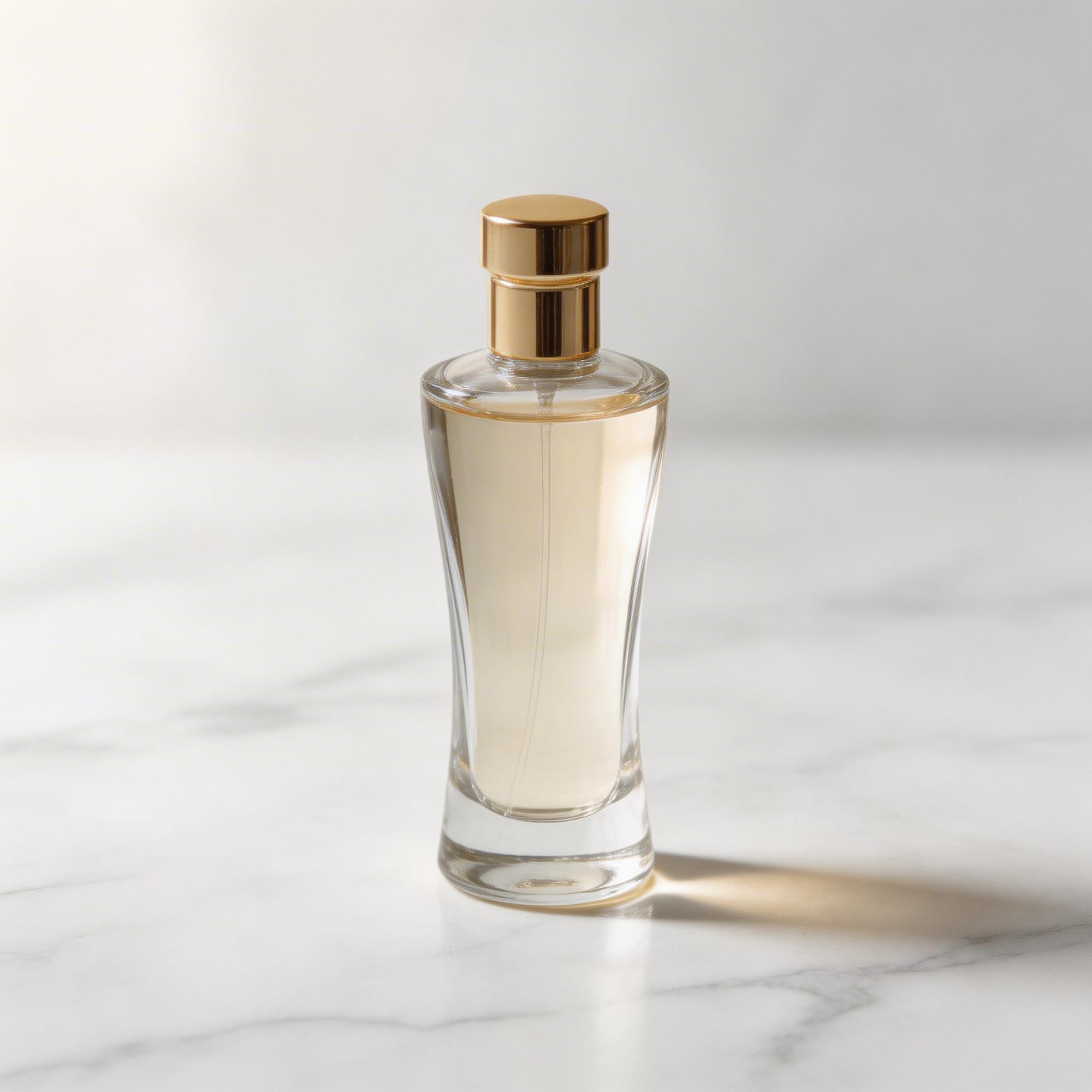 "prompt": "Luxury glass perfume bottle on white marble, professional studio photography",
