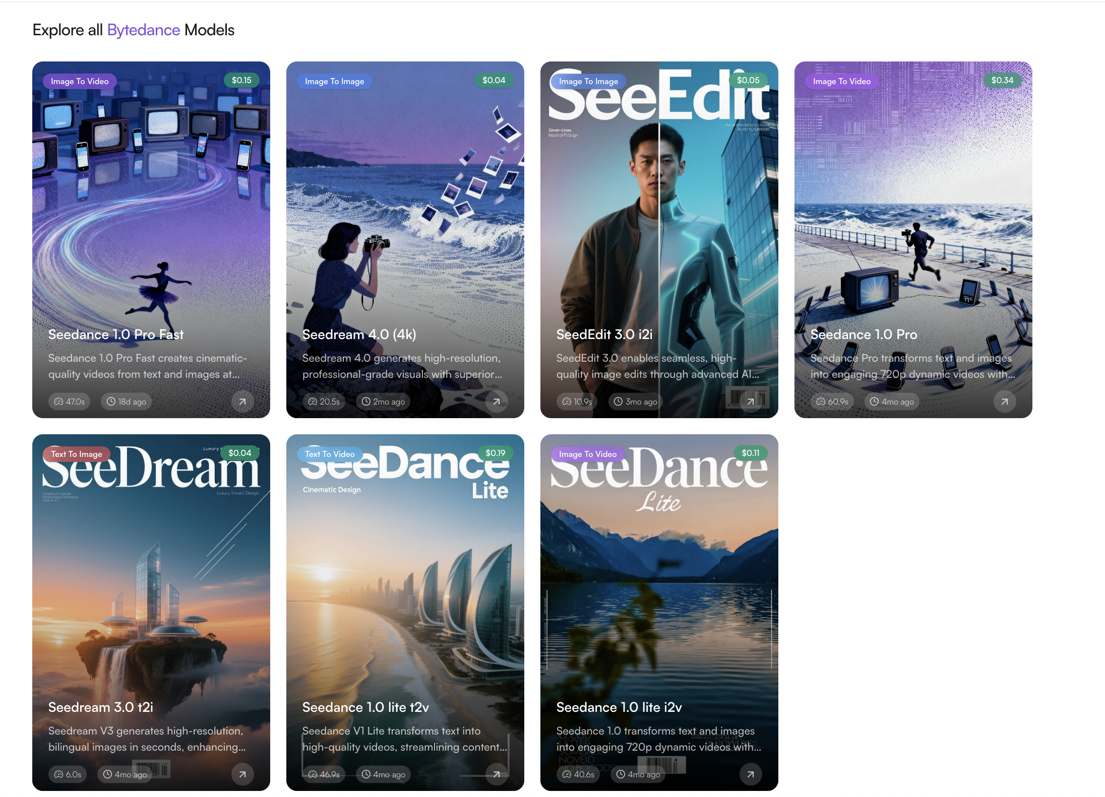 - Seedance 1.0 Pro Fast: Perfect for cinematic-quality video generation from text and images.