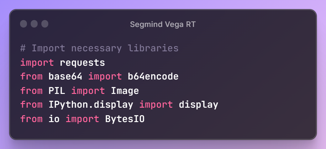 First, let's define the libraries that will assist us in interacting with the Segmind Vega RT API and processing the images.