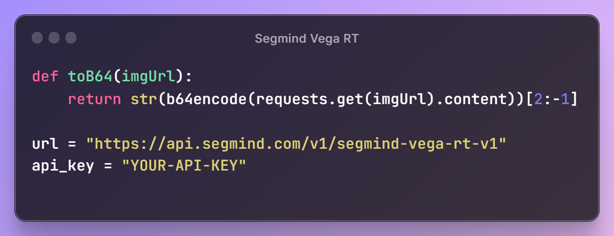 Next, we'll set up our Segmind Vega RT URL and API key, granting access to Segmind's models. Additionally, we'll define a utility function, toB64, to read image files and convert them into the appropriate format for building the request payload.