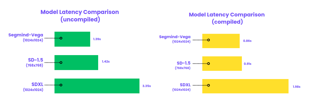 When it comes to compiled model latency, the efficiency of Segmind Vega becomes even more pronounced. Vega's compiled latency is recorded at a mere 0.86 seconds, significantly faster than both the SD1.5 and SDXL models, which clock in at 0.91 seconds and 1.98 seconds, respectively. The fact that Vega maintains this performance advantage while generating images at a higher resolution than SD1.5 underscores its optimized performance capabilities, making it a formidable choice for applications where speed is of the essence.
