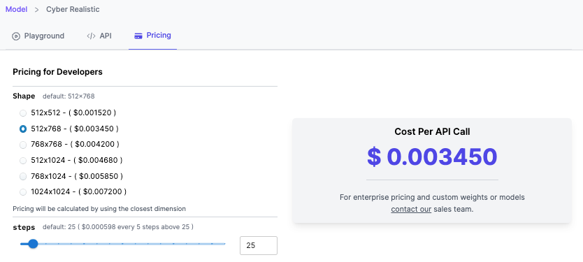 For example: To use our Cyber Realistic SD 1.5 model, earlier each inference would cost 1 credit, but now the same model will cost $0.00345 for each inference.