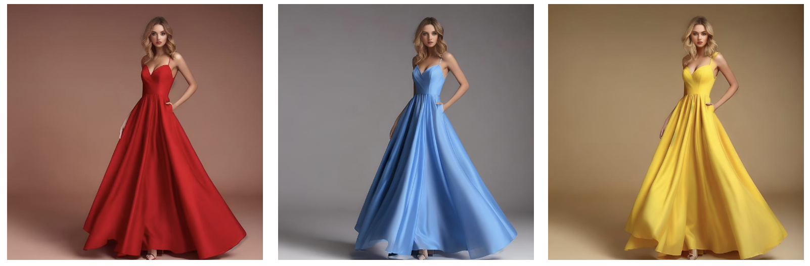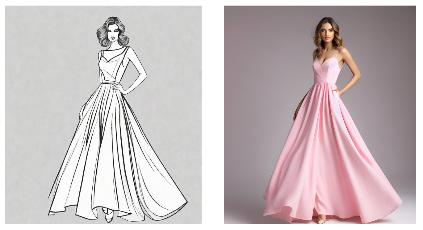 The sketch serves as input for the ControlNet Depth model. Alongside this input image, a prompt is provided to instruct the model in generating the desired images. This prompts the user to articulate specific expectations for the resulting image, such as specifying the dress color and describing the desired ethnicity of the model. This process ensures a highly personalized and tailored outcome, catering to the user's aesthetic preferences and creative vision.