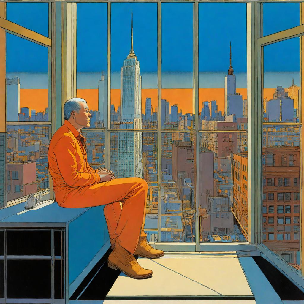 Prompt : A guy sitting alone in front of huge windows watching the sunset , cinematic lighting