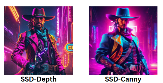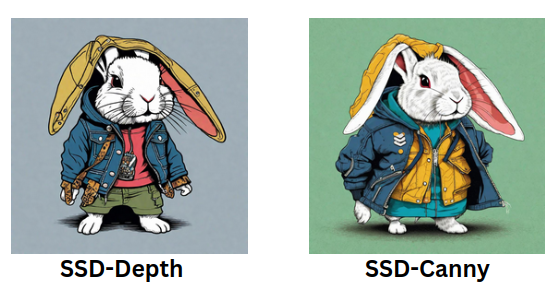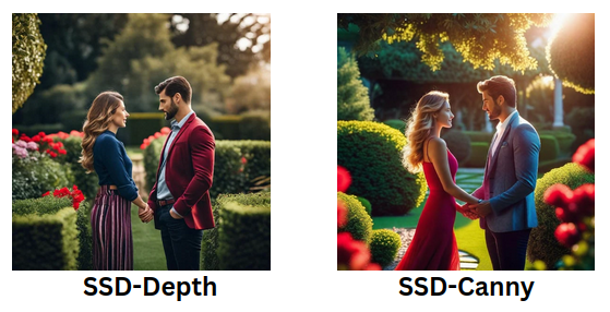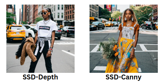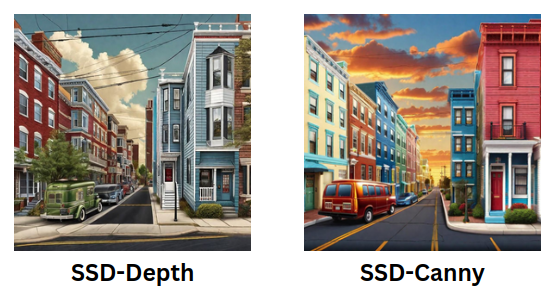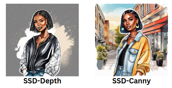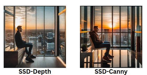 While the SSD-Canny images stand out with their abundance of details and structured appearance, creating a well-defined visual output. On the other hand, SSD-Depth tends to render images with more emphasis on texture and a smoother overall aesthetic.