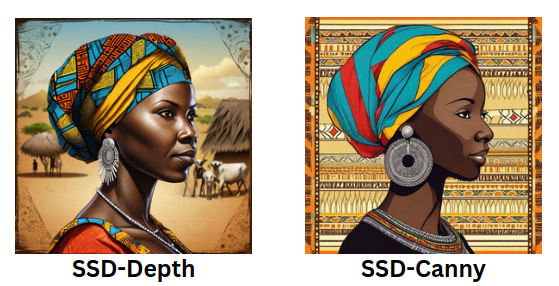 It's noticeable that SSD-Depth has captured and rendered the essence of the last line of the prompt related to the rural African village. In contrast, SSD-Canny excels in understanding and reproducing the edges present in the input image, aligning with its inherent strength in edge detection and transformation.