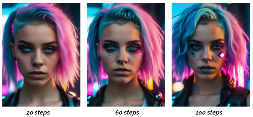 It indicates the number of denoising steps, where the model iteratively refines an image generated from random noise derived from a text input. With each step, the model removes some noise, leading to a progressive enhancement in the quality of the generated image. A greater number of steps correlates with the production of higher-quality images.