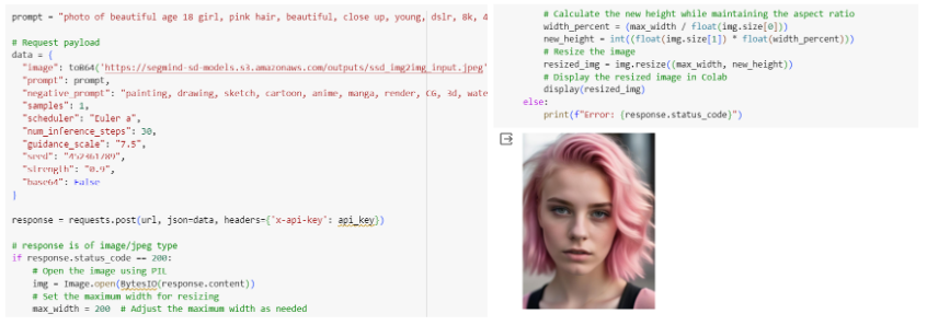 You also have the option to utilize the SSD-1B Img2Img through an API. This flexibility allows you to seamlessly integrate it into your workflow using languages like Bash, Python, and JavaScript. You can see the sample code at Segmind Img2Img