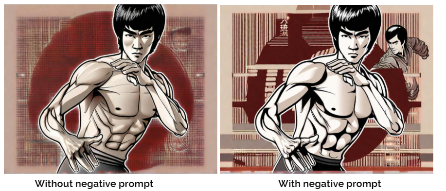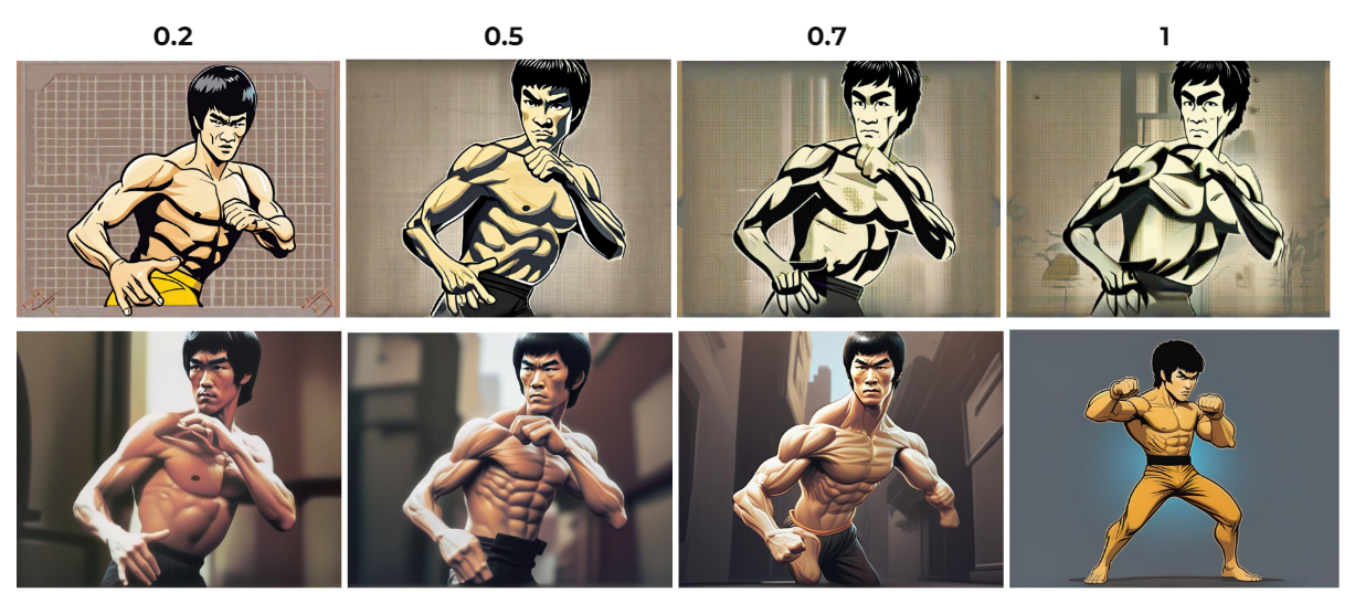 Examining the image-to-image generation using SSD-1B Img2Img in the bottom row reveals an issue: When the denoising strength was low, the image didn't undergo sufficient changes. On the other hand, at high denoising strength, Bruce Lee is still visible, but the original composition was compromised.