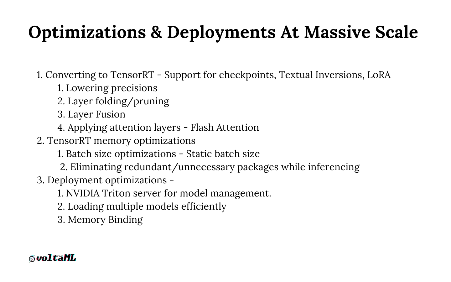 For deployments, we use Nvidia Triton servers to serve models efficiently. We have observed that Triton is capable of serving parallel models at the same time and has better CUDA core utilizations and optimizations without giving any code errors and memory leakages. Handling parallel requests at the same time is a task that Rest API Services need to handle. These are a few of the optimizations and advancements we have built at voltaML.