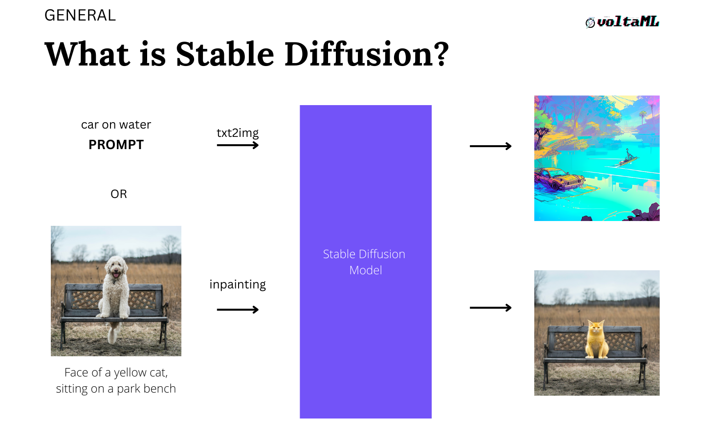 Stable diffusion is a very versatile generative AI model. It can be used in a few ways. The simplest way that it can be used is to create an image from text. You can send in a prompt, let's say 'cat' which is one word and the model takes that in on one side and creates an image for you as an output. You can also use it to edit an image which is technically called in-painting, where you parse an image and ask it to do some changes to it.