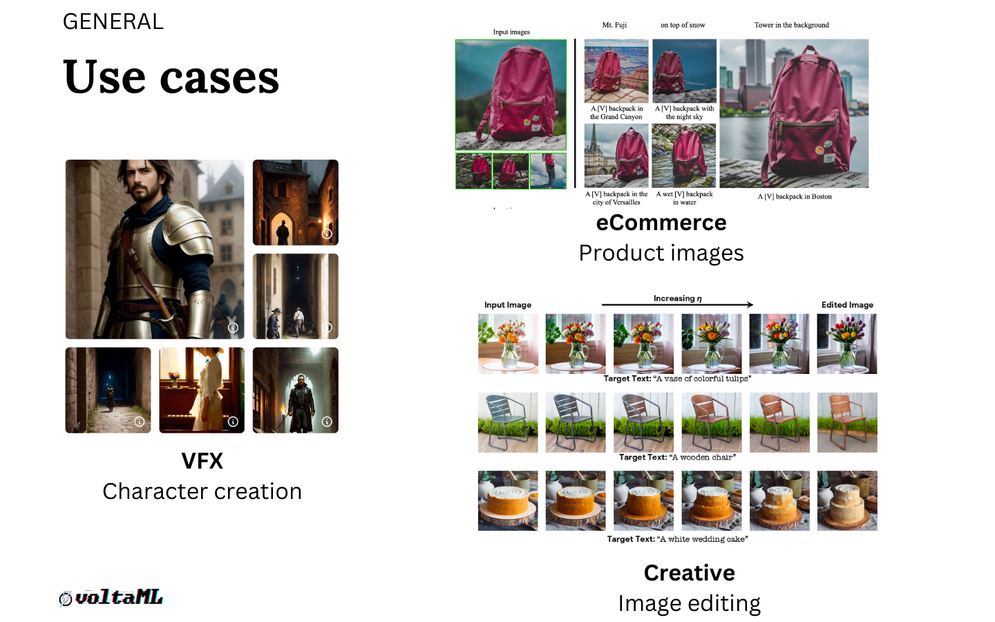 Image editing: we're seeing a lot of use cases in image editing. Hundreds of apps have come out with in-painting as one of their core features where you can take an image and say change x. Let's say in the first image you have yellow flowers and you want purple flowers so you can prompt 'change the color of the flowers to purple' and it will output the same image with purple flowers.