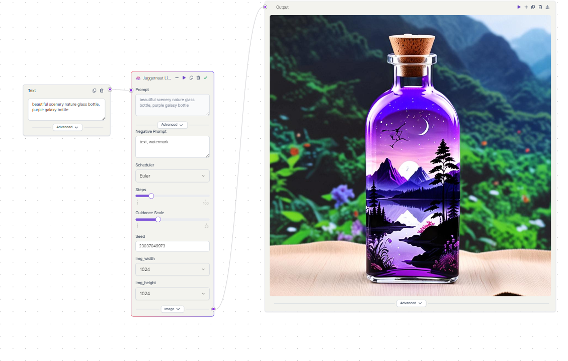 As you can see, we managed to build a workflow with just 3 nodes as compared to 7 nodes in ComfyUI. Actually, we can even skip the text input node as the model node has both positive and negative prompts.