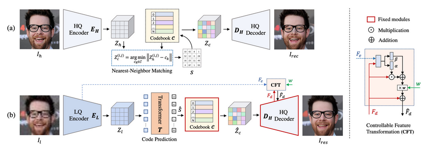 The process begins by acquiring a discrete codebook and a decoder through self-reconstruction learning to effectively store the high-quality visual components of the facial images. Once the codebook and decoder are fixed, the transformer module is introduced which helps in predicting the code sequence thus enabling face composition for low-quality inputs.
