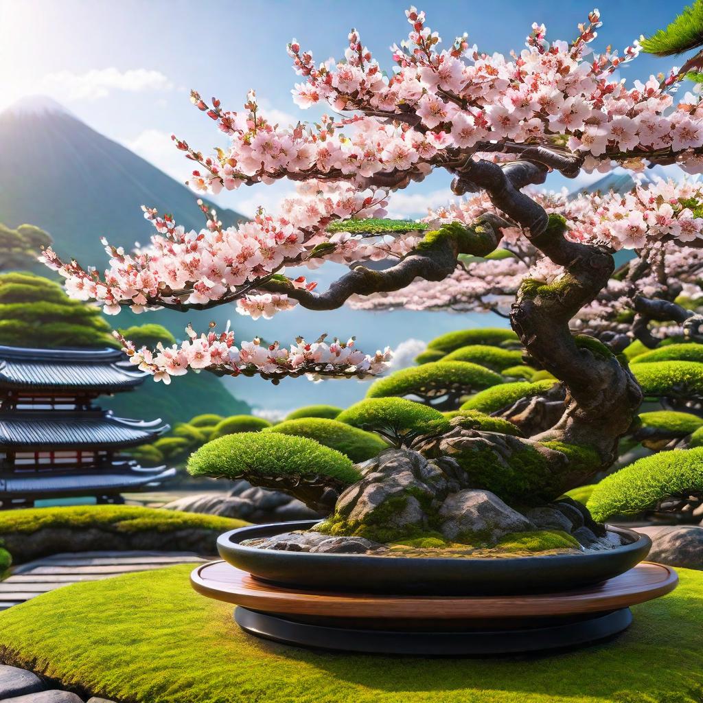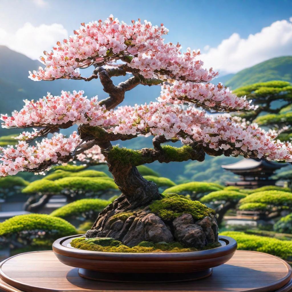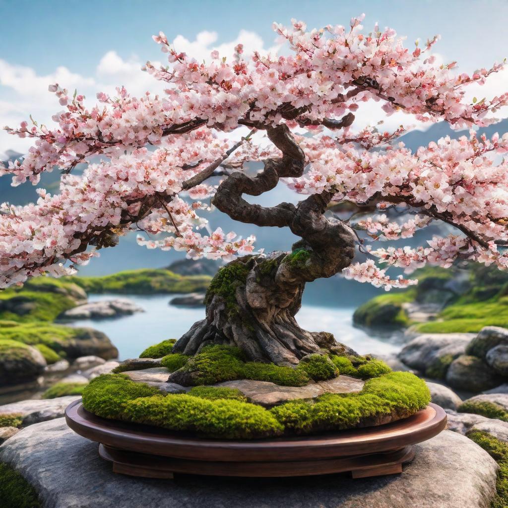 Prompt : cherry blossoms, bonsai, Japanese style landscape , high resolution , 8k , lush greens in the background .
