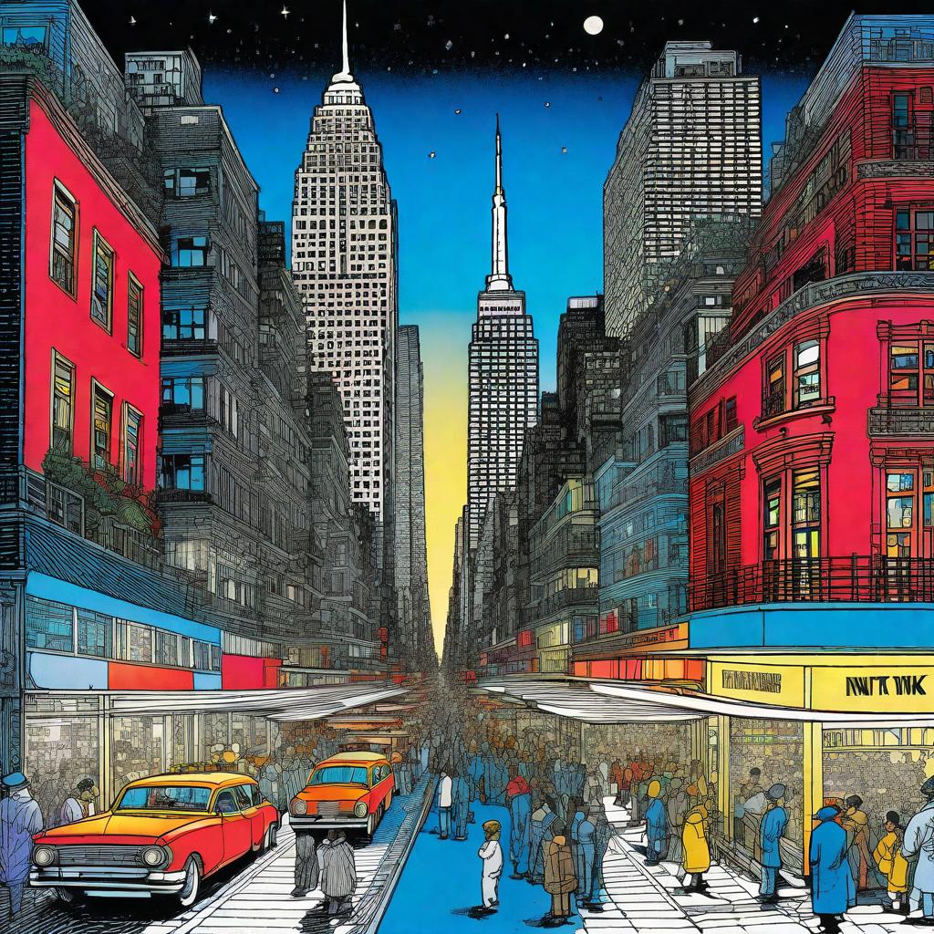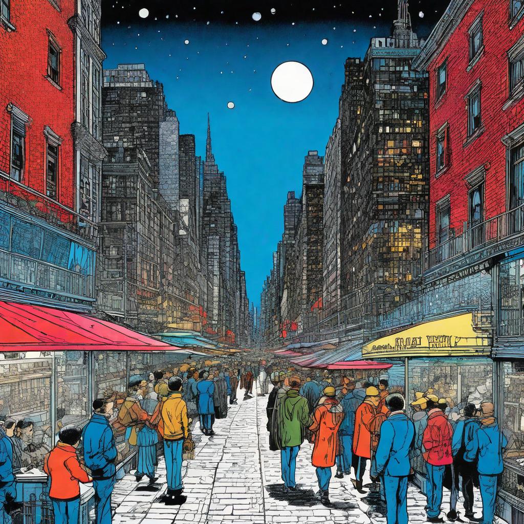 Prompt:detailed pen and ink illustration of a New York neighborhood by Herge, in the style of tin-tin comics, vibrant colors, detailed, lots of people, night time