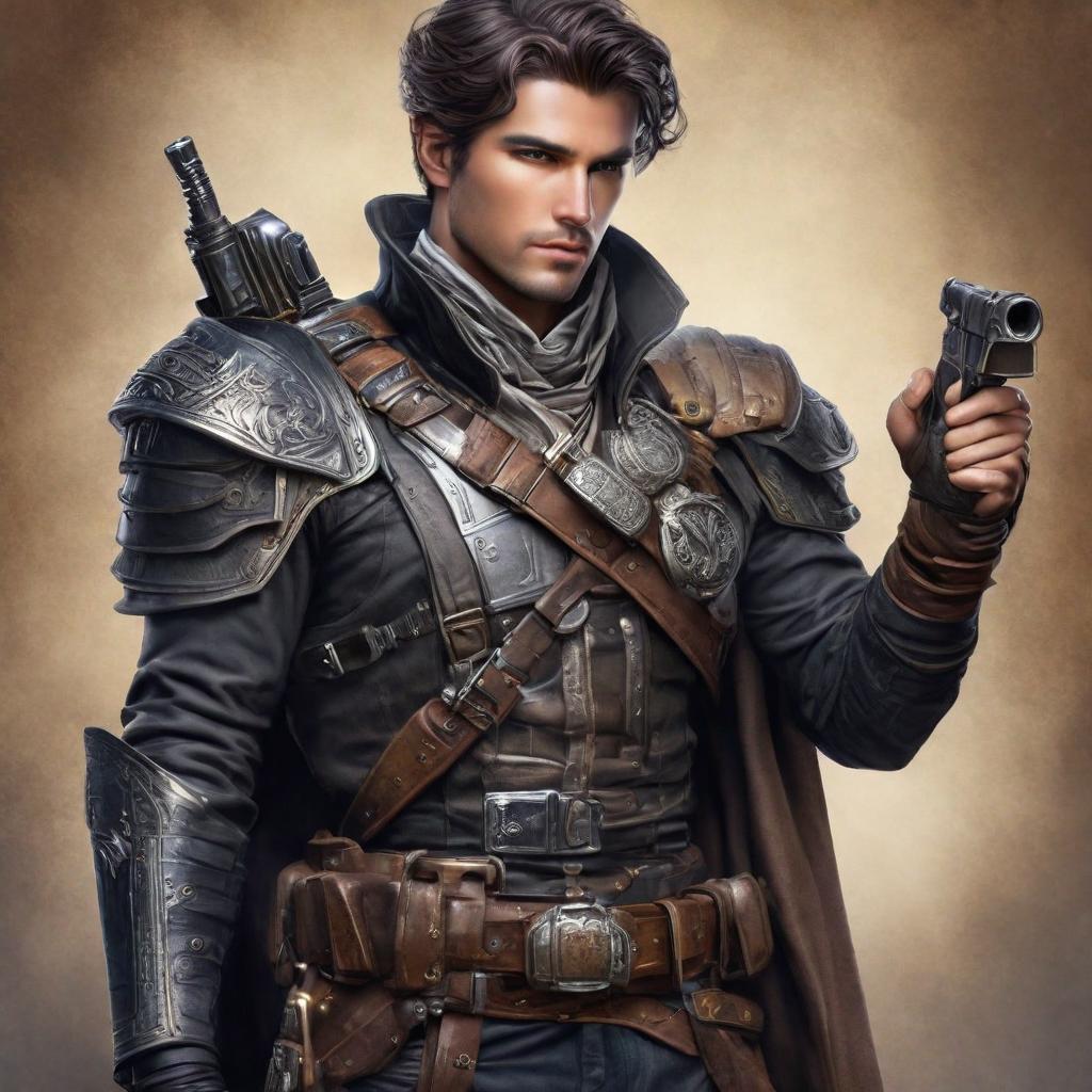 Prompt: male human bounty hunter treasure seeker, with a pistol in his right hand, fantasy, Victorian era